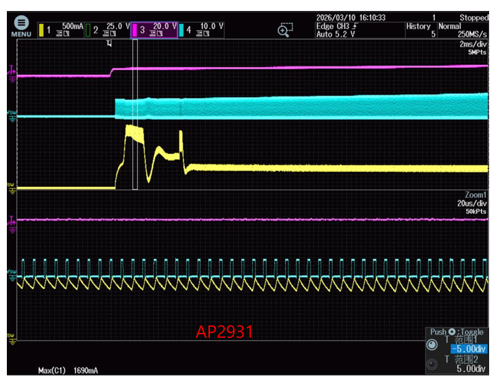 满载启动(CH1:黄色,电感电流;CH3:粉色,输入电压;CH4:蓝色,开关脚电压)
