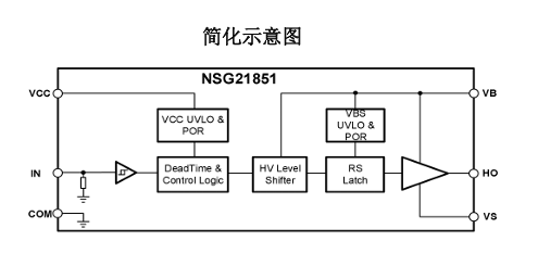NSG21851是一款高压、高速功率MOSFET/IGBT高侧驱动芯片。内部集成了高侧欠压锁定电路、过压钳位电路等保护电路,具备大电流脉冲输出能力,逻辑输入电平兼容低至3.3V的CMOS或LSTTL逻辑输出电平,输出电流能力最大可达4A,其浮地通道最高工作电压可达700V。可用于驱动N沟道高压功率MOSFET/IGBT等器件。