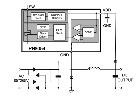 PN8054集成PFM控制器及650V高雪崩能力智能功率MOSFET,用于外围元器件精简的小功率非隔离开关电源。