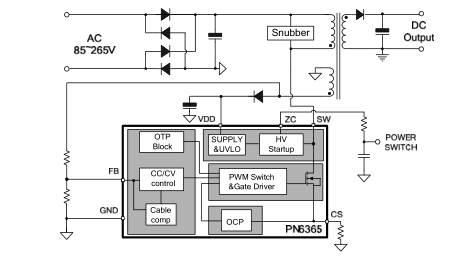 PN6365集成零待机模式的准谐振原边控制器及典型720V高雪崩能力智能功率MOSFET,适用于高性能、外围元器件精简的智能断路器电源。PN6365为原边反馈工作模式,可省略光耦和TL431,并且PN6365提供可控零待机模式,此时相线电流平均值可小于0.10mA。在恒压模式,输出电压通过FB脚的电阻比例进行调节;在恒流模式,输出电流通过CS脚的电阻值进行调节。该芯片还提供的智能保护功能,包含逐周期过流保护、过压保护、开环保护、过温保护、输出短路保护和CS开/短路保护等。