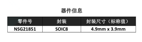 NSG21851是一款高压、高速功率MOSFET/IGBT高侧驱动芯片。内部集成了高侧欠压锁定电路、过压钳位电路等保护电路,具备大电流脉冲输出能力,逻辑输入电平兼容低至3.3V的CMOS或LSTTL逻辑输出电平,输出电流能力最大可达4A,其浮地通道最高工作电压可达700V。可用于驱动N沟道高压功率MOSFET/IGBT等器件。