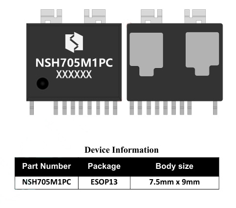 NSH705M1PC是一款7A、500V半桥智能功率模块,专为电机驱动应用设计。该模块集成了7A/500V MOSFET栅极驱动器与自举升压功能,采用紧凑的ESOP13封装,可灵活应用于单相及三相直流无刷电机驱动系统。