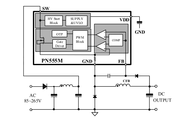 芯朋微固定5V450mA非隔离电源管理驱动芯片PN555MSE-B1